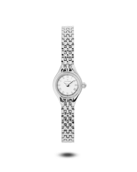 Heritage Petite er en elegant dameklokke med klassisk design og kompakt størrelse. Klokken har en hvit urskive med romerske tall, ripe- og støtsikkert mineralglass og et slankt lenkearmbånd i rustfritt stål.