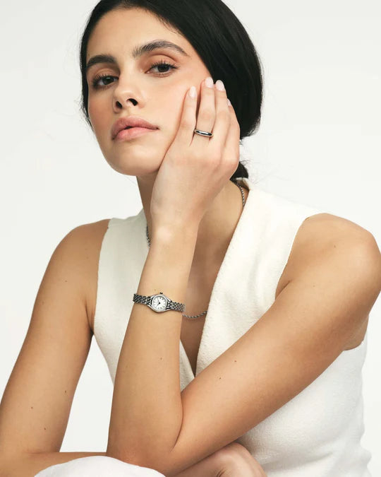 Heritage er en elegant dameklokke med klassisk design og kompakt størrelse. Klokken har en hvit urskive med romerske tall, ripe- og støtsikkert mineralglass og et slankt lenkearmbånd i rustfritt stål.